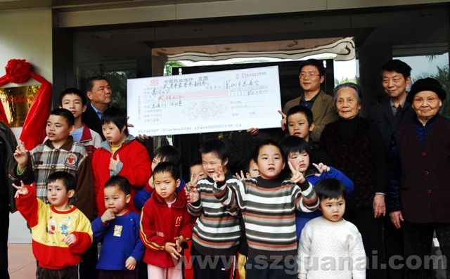 兩名小學生為我市在河源市福利中心設立的“深圳慈善教育基地”揭牌(陳錦輝攝)