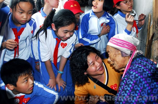 孩子們將深圳人民捐贈的棉被送到老人院里(陳錦輝攝)