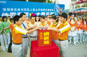 這是一串堅實的愛的足跡——2005年1月,深圳歡樂谷組織員工為海嘯災(zāi)區(qū)獻愛心,共計捐款1萬多元,衣物1000多件;同年4月,歡樂谷組織員工為貴州貧困地區(qū)捐款1.5萬多元,衣物900多件;2007年,深圳歡樂谷攜手北京歡樂谷,啟動以“十分·愛”為主題的公益募捐活動,從7月1日至10月8日的100天內(nèi),深圳歡樂谷每售出一張門票都會捐出一角錢,善款全部用于扶持黔東南貧困地區(qū)的教育事業(yè)。2008年汶川大地震后,歡樂谷向災(zāi)區(qū)捐款200萬,員工們自發(fā)捐款8萬元;2008年7月16日下午,歡樂谷接待了來自北川中學(xué)的百名學(xué)生。
