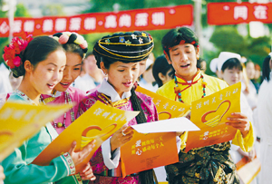 ??? 在“深圳關(guān)愛行動(dòng)”福田區(qū)分會(huì)場(chǎng)隆重的啟動(dòng)儀式上,身著民族服裝的青年男女放聲歌唱,成為亮麗的風(fēng)景。