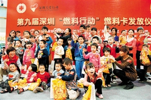 昨天,深圳益田假日中庭廣場傳出孩子們的陣陣歡笑聲,由市關愛辦、市紅十字會、深圳晚報、富士康科技集團主辦,麥當勞餐廳(深圳)有限公司、深圳市血液中心、深圳市第二人民醫院、香蜜湖獅子會協辦的第九屆燃料行動“燃料卡”發放儀式在這里舉行。41名地貧兒歡天喜地領到凝結著富士康科技集團和社會各界愛心的“燃料卡”。這些“燃料卡”將為特困地貧兒提供12次免費輸血,在新的一年里幫助地貧兒延續生命。市文明辦副主任穆同倫表示,關愛地貧兒童的燃料行動已成為深圳關愛行動的一大愛心品牌,它將社會各界的愛心匯成生命的燃料,讓深圳的地貧兒沐浴著陽光,健康地成長。