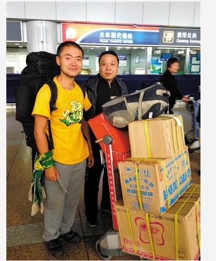 昨天傍晚7點半多,樊蒙一個人推著三四箱行李,背著一個大包出現在首都機場。黝黑的皮膚,碩大的行李,讓他在行人中很出眾。纏在手腕上一條綠色長巾讓他多了些民族風格,其實那是條國安球隊的圍巾,“我這一路都系著它,都有些發黑了。“樊蒙大笑。