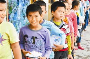 “第一次吃到新廚房的飯菜時(shí),好香,還有肉,我吃了一份還想吃!”13歲的五年級(jí)學(xué)生班明朝告訴記者,“我爸媽都在廣東打工。以前我要從家里背米來,還有柴”,老師幫他蒸飯,再澆上一點(diǎn)白菜或豆腐湯,就算一頓午飯。家里貧困的同學(xué)午餐有的吃玉米粥,還有的天天吃黃豆蒸飯。