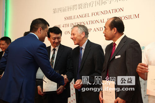 中國紅十字基金會常務(wù)副理事長兼秘書長孫碩鵬(右一)嫣然天使基金創(chuàng)始人李亞鵬先生 執(zhí)行總裁李詩女士為醫(yī)生代表頒獎