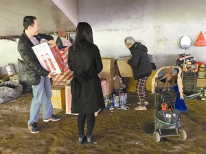 市救助站社工們給流浪人員送物資。