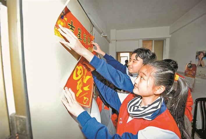 ▲參加愛心年夜飯活動(dòng)的孩子們幫受助家庭貼春聯(lián)。